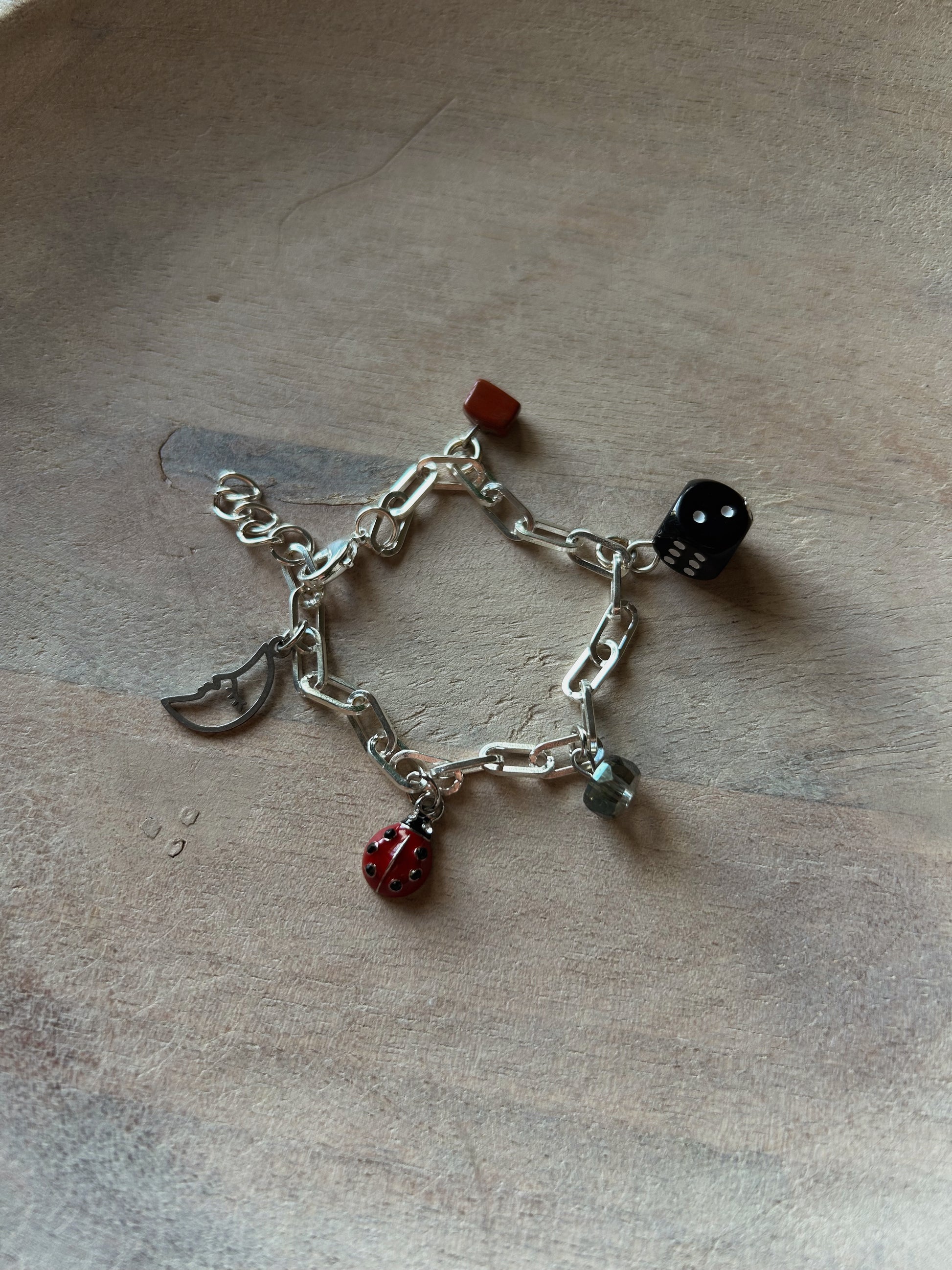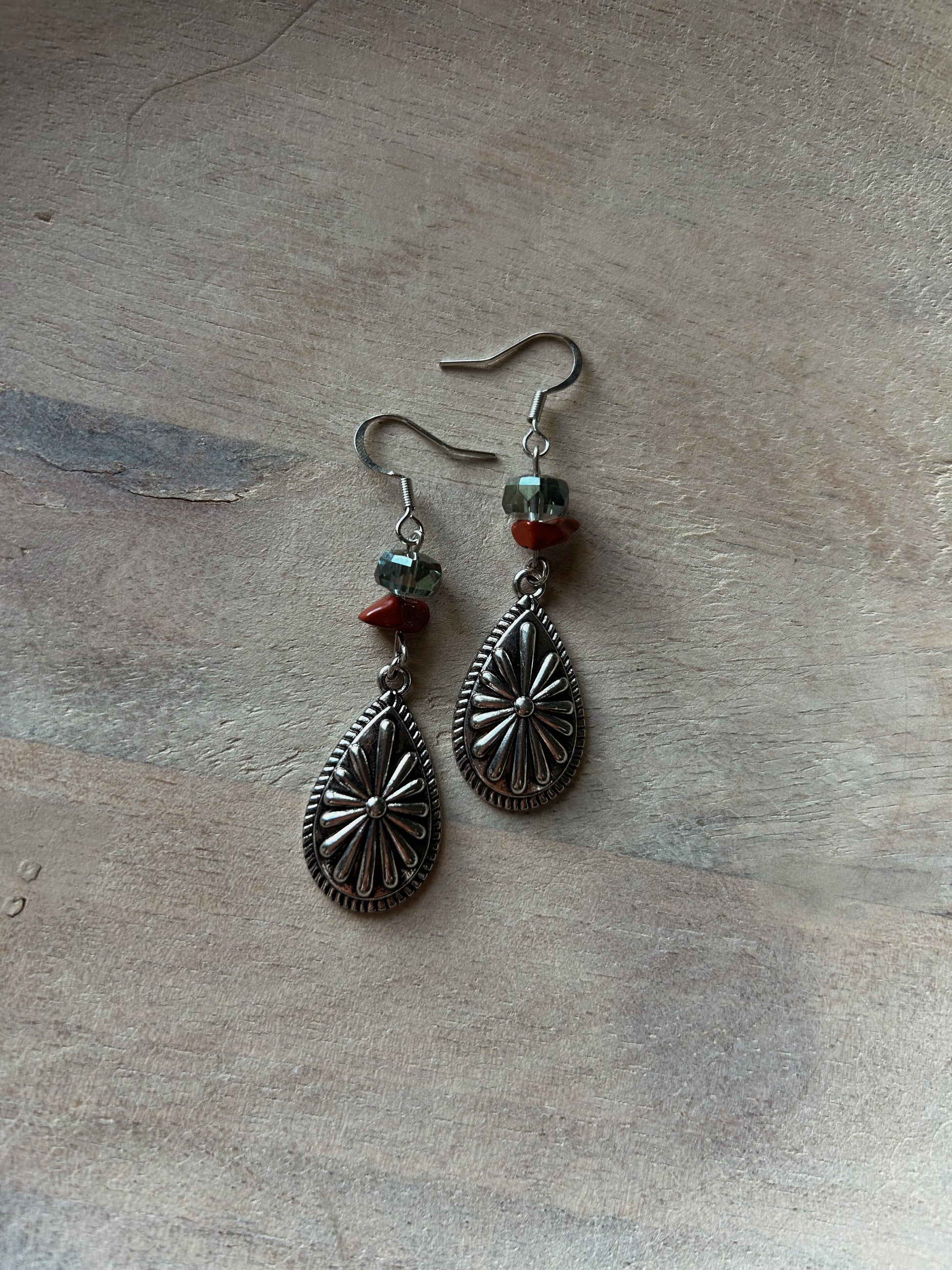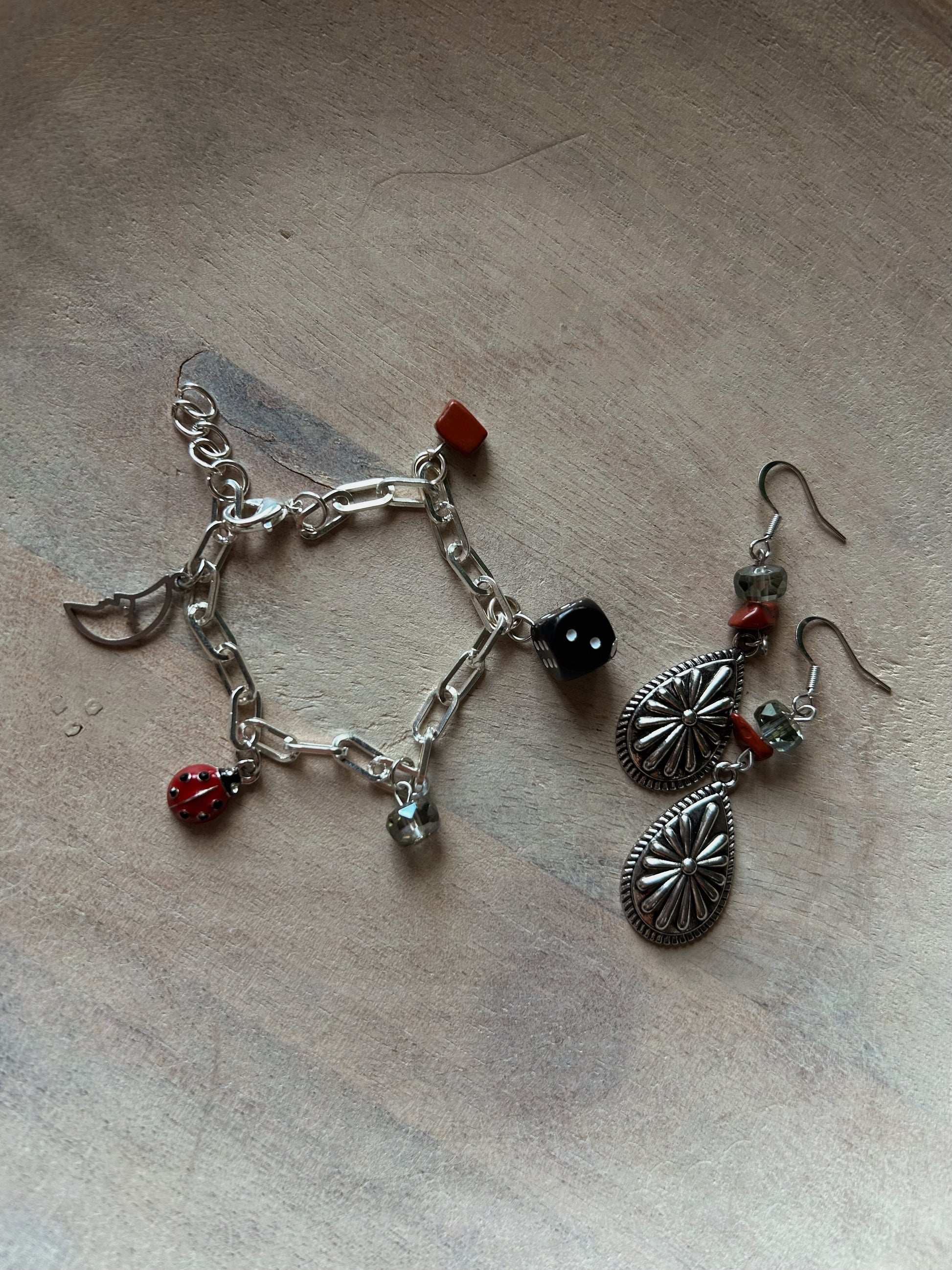 This bundle includes one pair of red jasper silver earrings and one matching charm bracelet